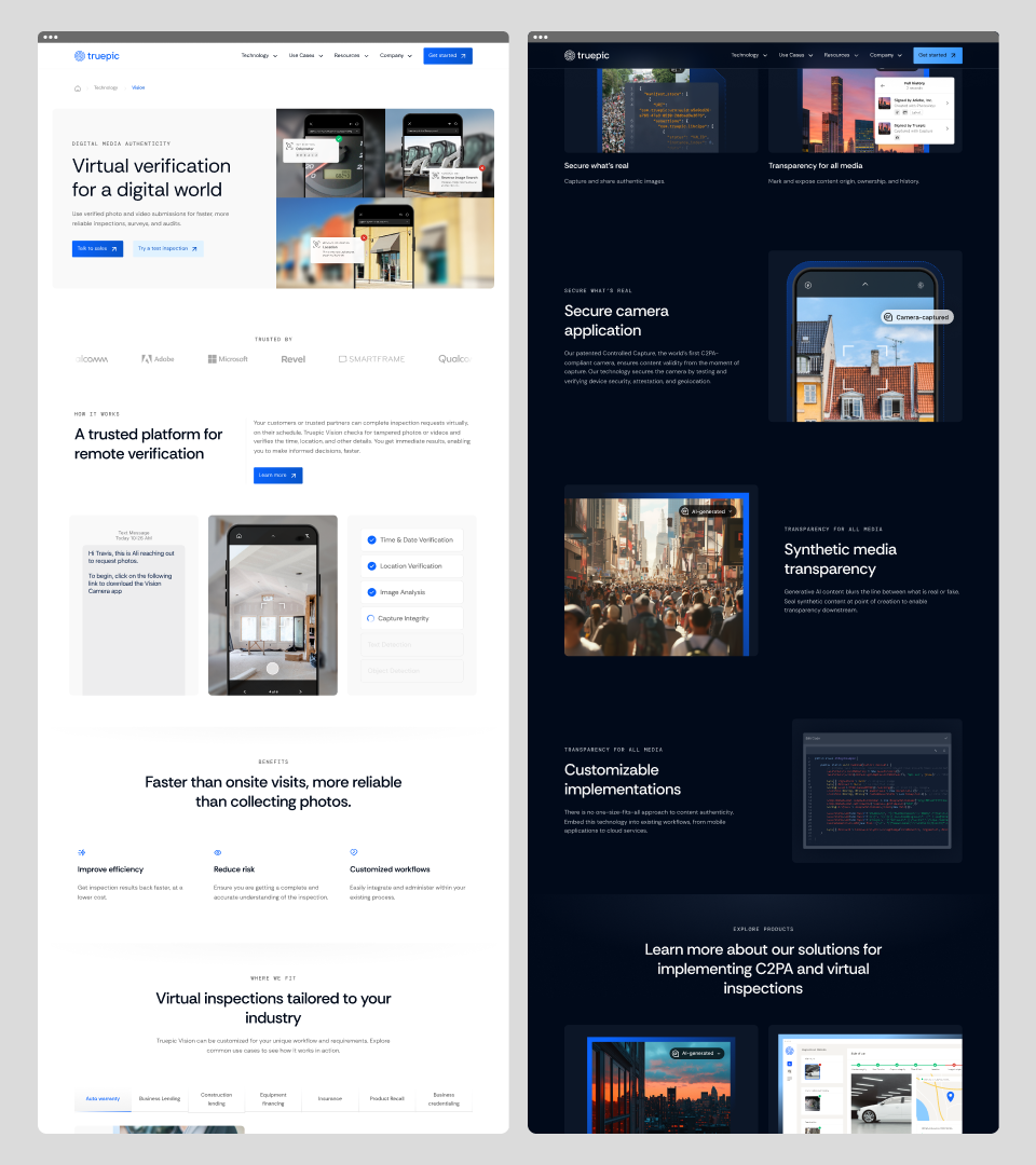 Truepic helps businesses trust what they see — authenticating visuals, blocking AI manipulation, and providing insights to prevent fraud.