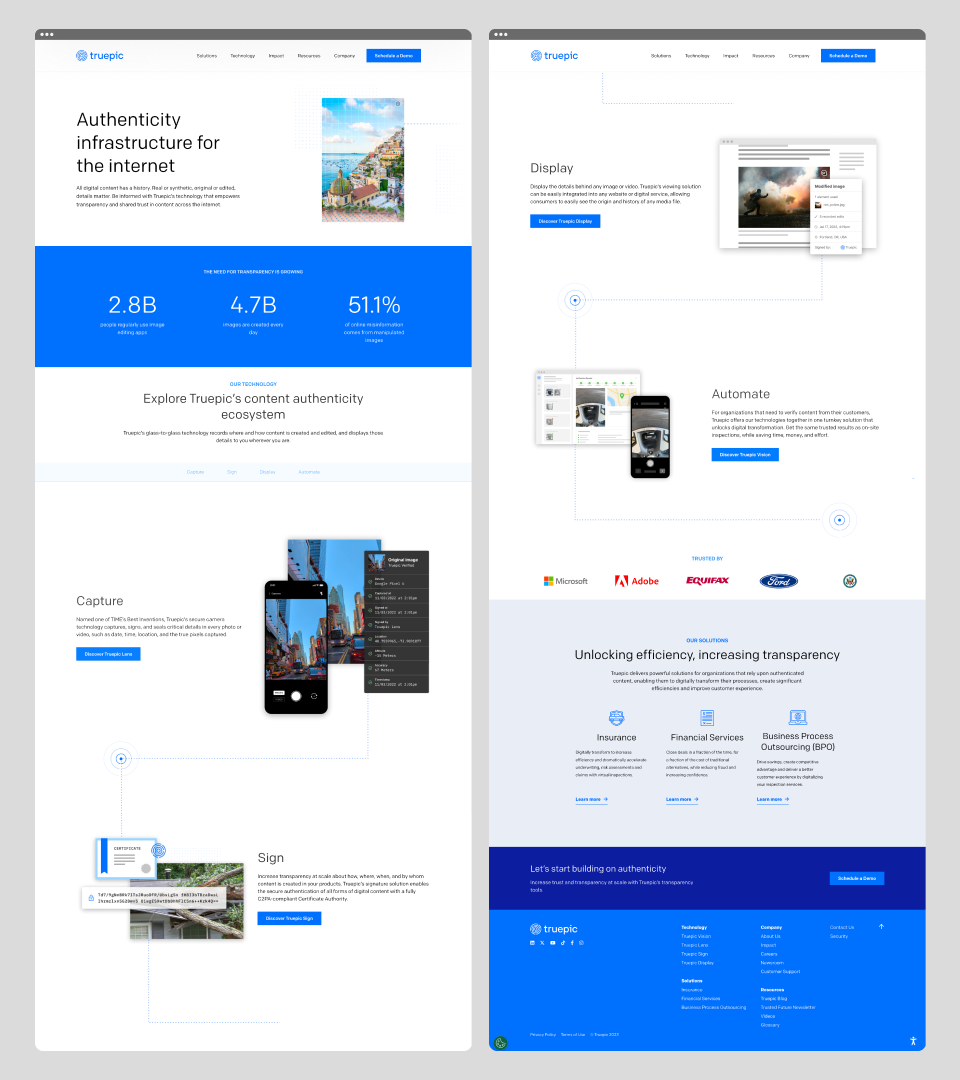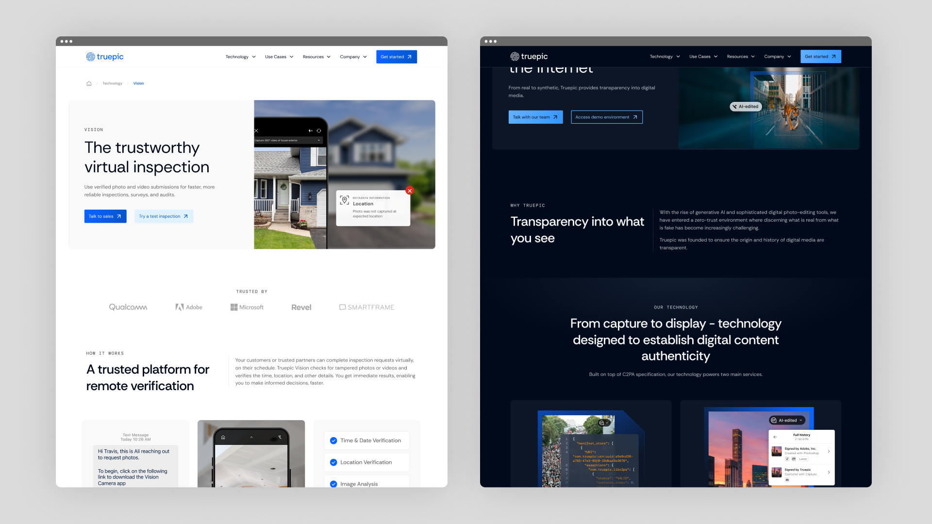 For the last three years I have worked as the Senior Brand Designer at Truepic. While there I was tasked with revamping the Truepic brand identity. My aim was to address various issues — from implementation headaches to personality misalignment — and attempt to meet the moment in a rapidly evolving market. Through a collaborative internal process, we reimagined and solidified the entire identity, including full color palette, typography, iconography, illustration, and layout structures. I also expanded the brand identity into all visual facets of the company, including an overhaul the marketing website.